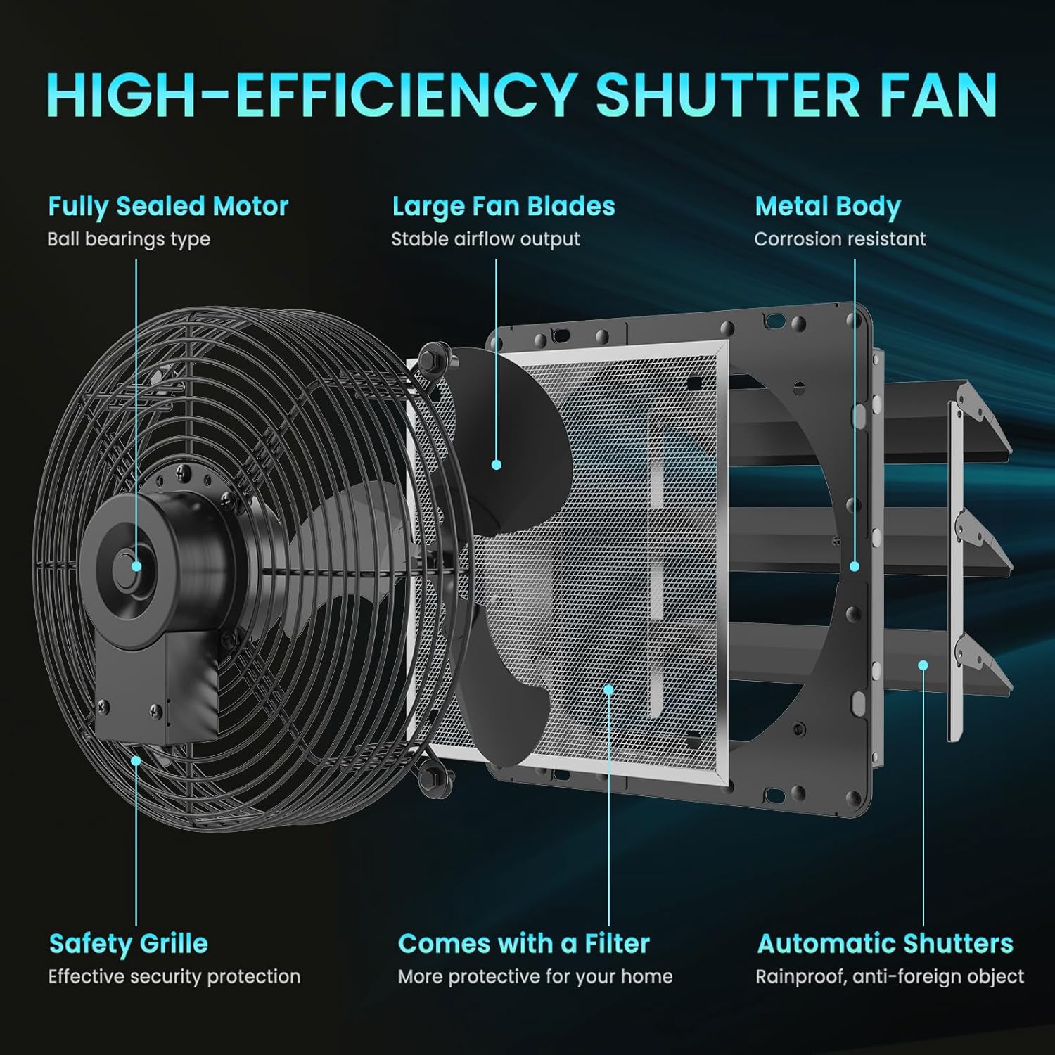 10" Shutter Exhaust Fan, 647CFM Low Noise with Mesh Screen for Basement, Shed, Gable, or Chicken Coop Ventilation, Black