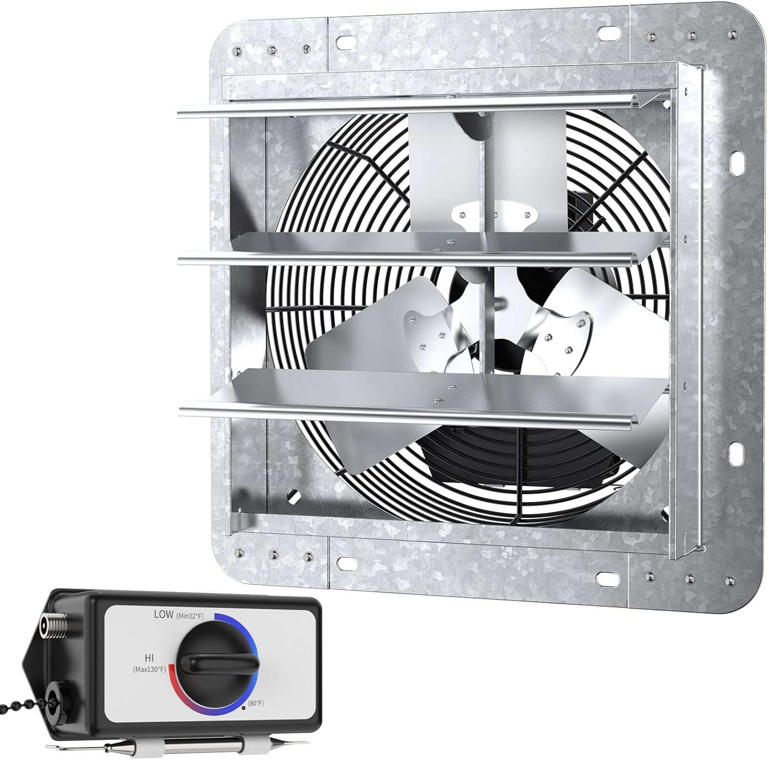 12" Wall Mounted Shutter Exhaust Fan with Thermostat and 3-Speed Control, 960CFM, 1200 SQF Ventilation for Attic, Shed, or Garage, Silver