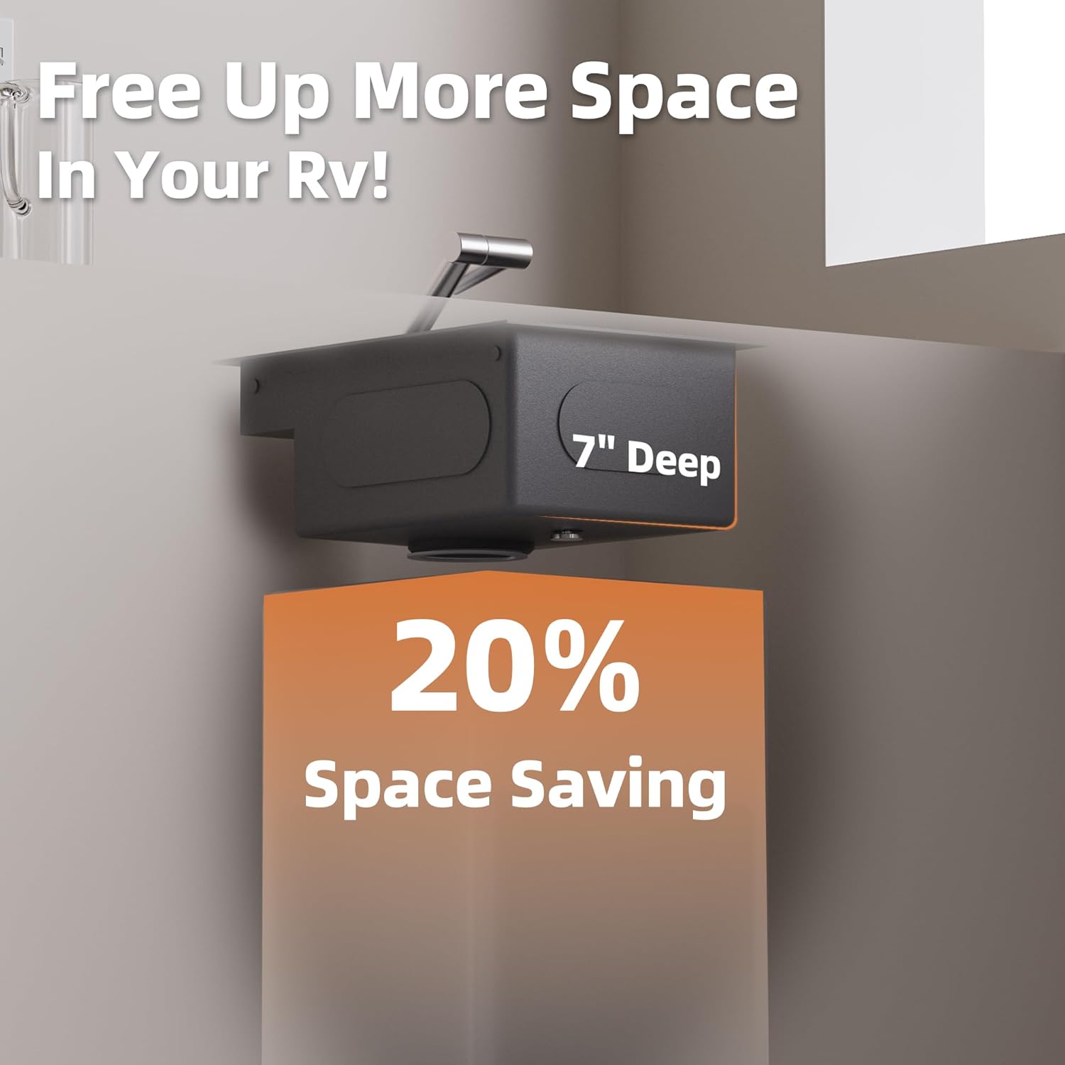 With a 7-inch depth, this compact sink maximizes undercounter storage while still accommodating daily use. Ideal for RV kitchens, tiny homes, and van conversions. -