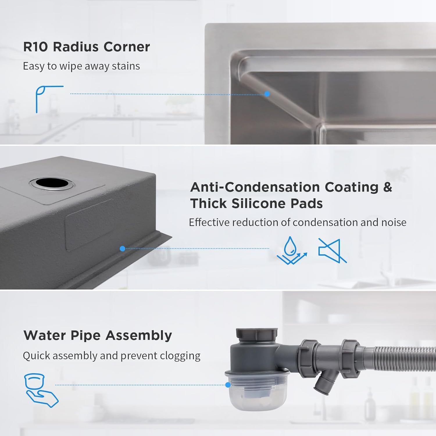 🔹 Smart Features – R10 rounded corners for easy cleaning, protective pipe lid to block food debris, and a deep 10-inch bowl for washing oversized pots and pans.