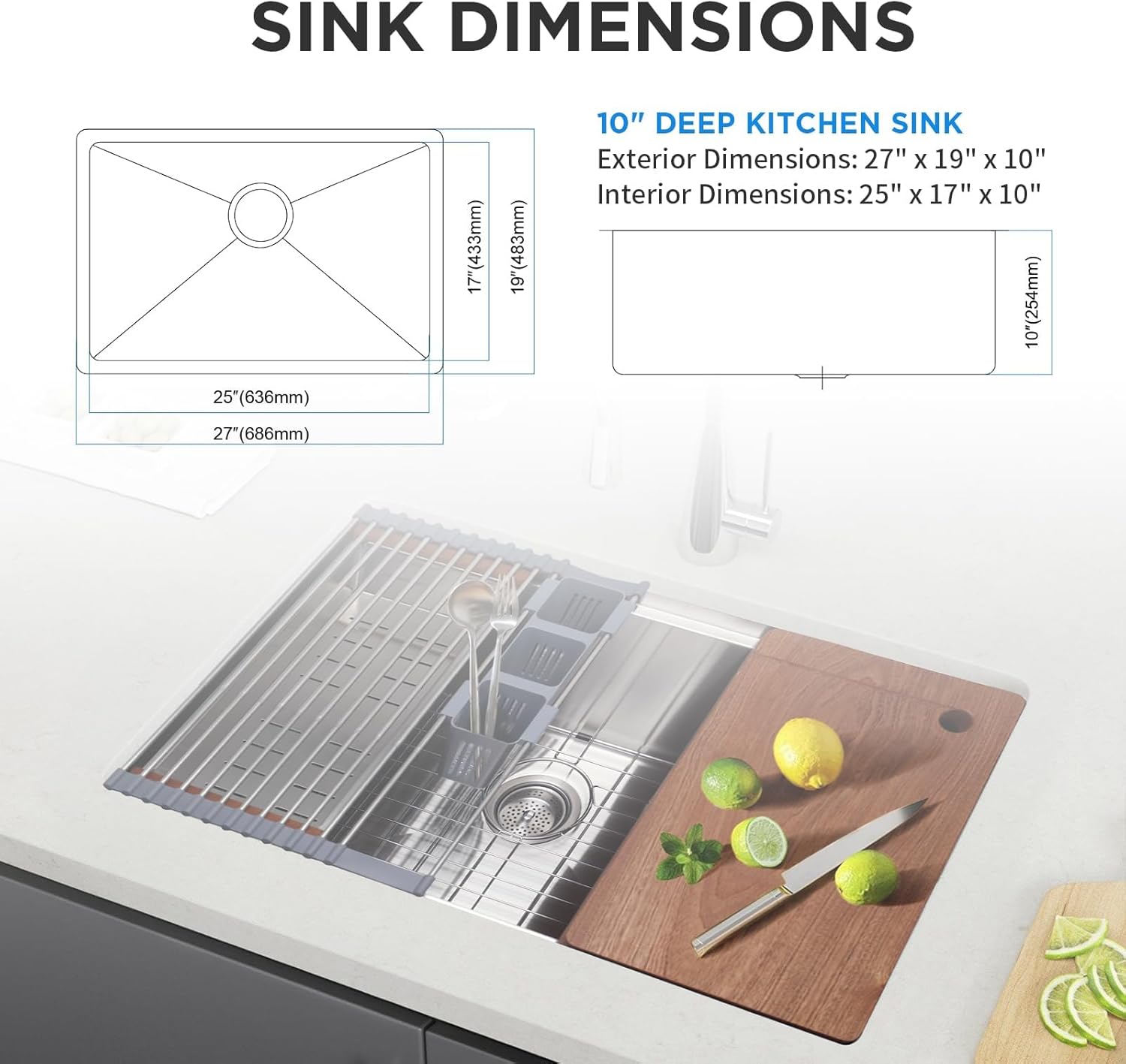 🔹 Generous Size – Exterior dimensions: 27" W x 19" L x 10" D, providing ample space while maintaining a sleek, modern undermount design that blends seamlessly with any kitchen style.