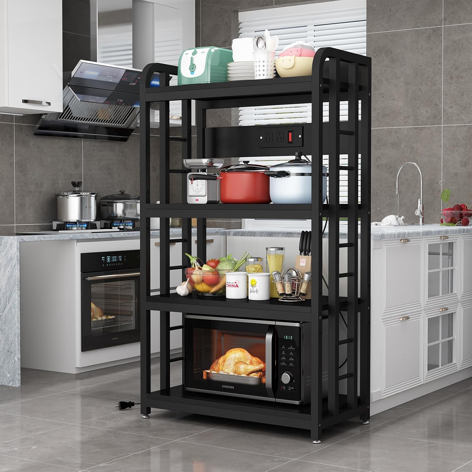 Adjustable & Flexible Design – Features 6-level adjustable shelves. The middle two shelves can be repositioned to fit appliances of different heights. The third shelf can also be removed, creating extra space for large items without sacrificing stability.