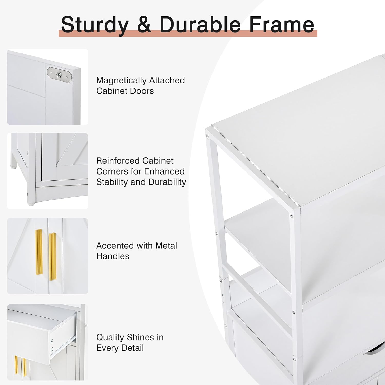 Farmhouse-Inspired Design – Featuring barn-style cabinet doors and a sleek white finish, this versatile storage cabinet adds rustic charm to your kitchen, living room, bathroom, or dining area.