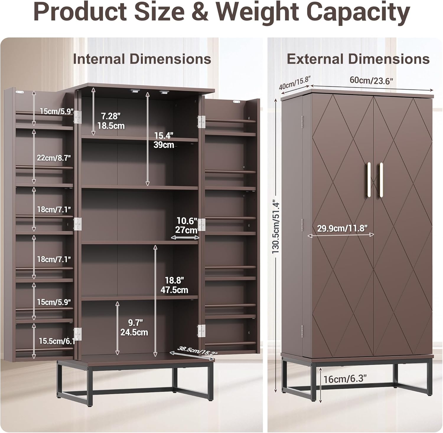 Measuring 24"W x 16"D x 51"H (60 x 40 x 130 cm), this pantry cabinet is designed with multi-level shelves for maximum organization. It includes two 6-level shelves, one 5-level compartment, and 4 adjustable shelves with 3 height options—perfect for storing cookware, small appliances, and kitchen essentials while keeping your space tidy.