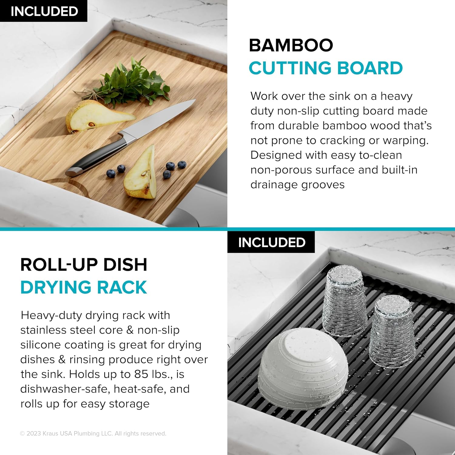 Complete Sink Kit – Includes bamboo cutting board, roll-up drying rack, protective stainless steel bottom grid, drain assembly with cover, installation hardware, and template for a hassle-free setup.