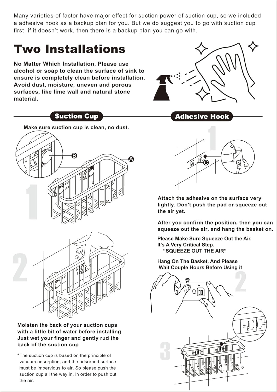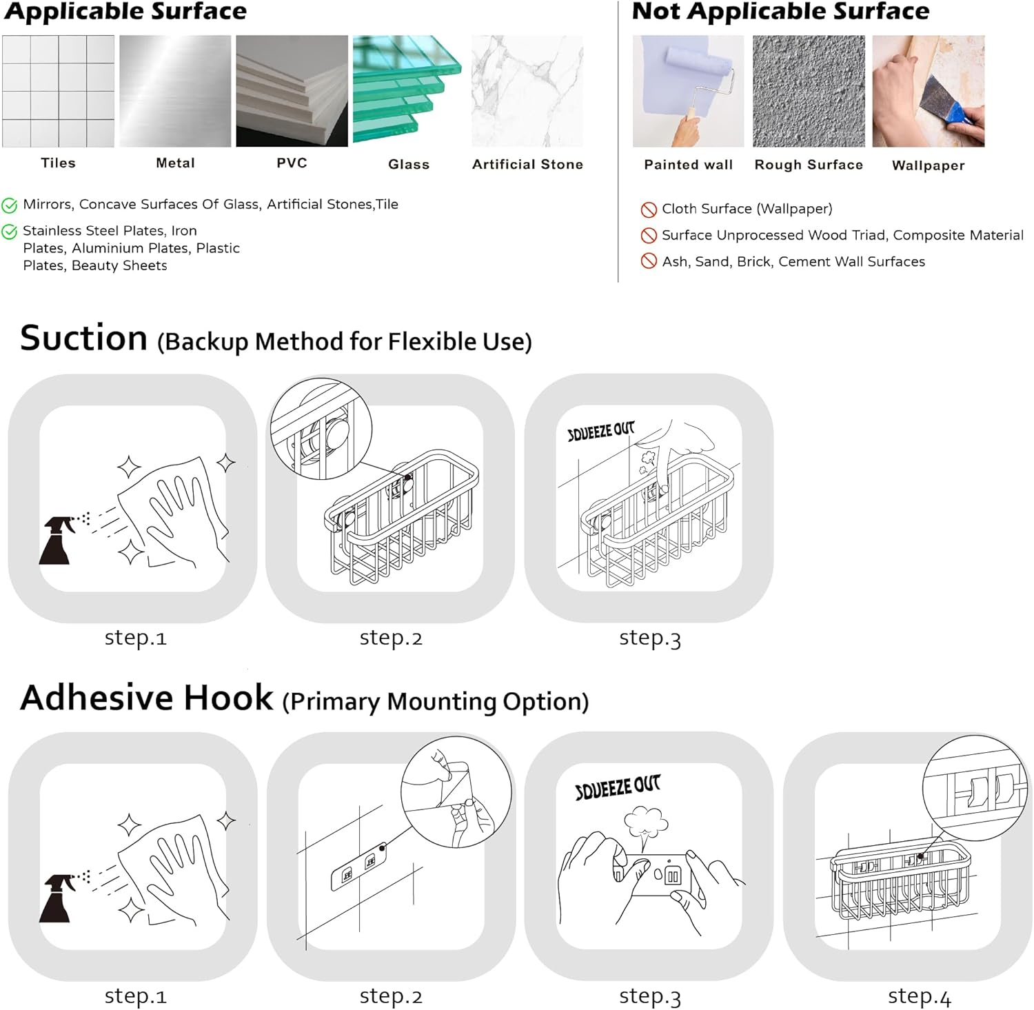 Important Compatibility Notice – Suction cups only work on smooth, non-porous surfaces such as polished tile, stainless steel, or glass. They are not suitable for stone, cement, granite, Silgranit, marble, or textured surfaces. For these, use the included adhesive pad for secure mounting.