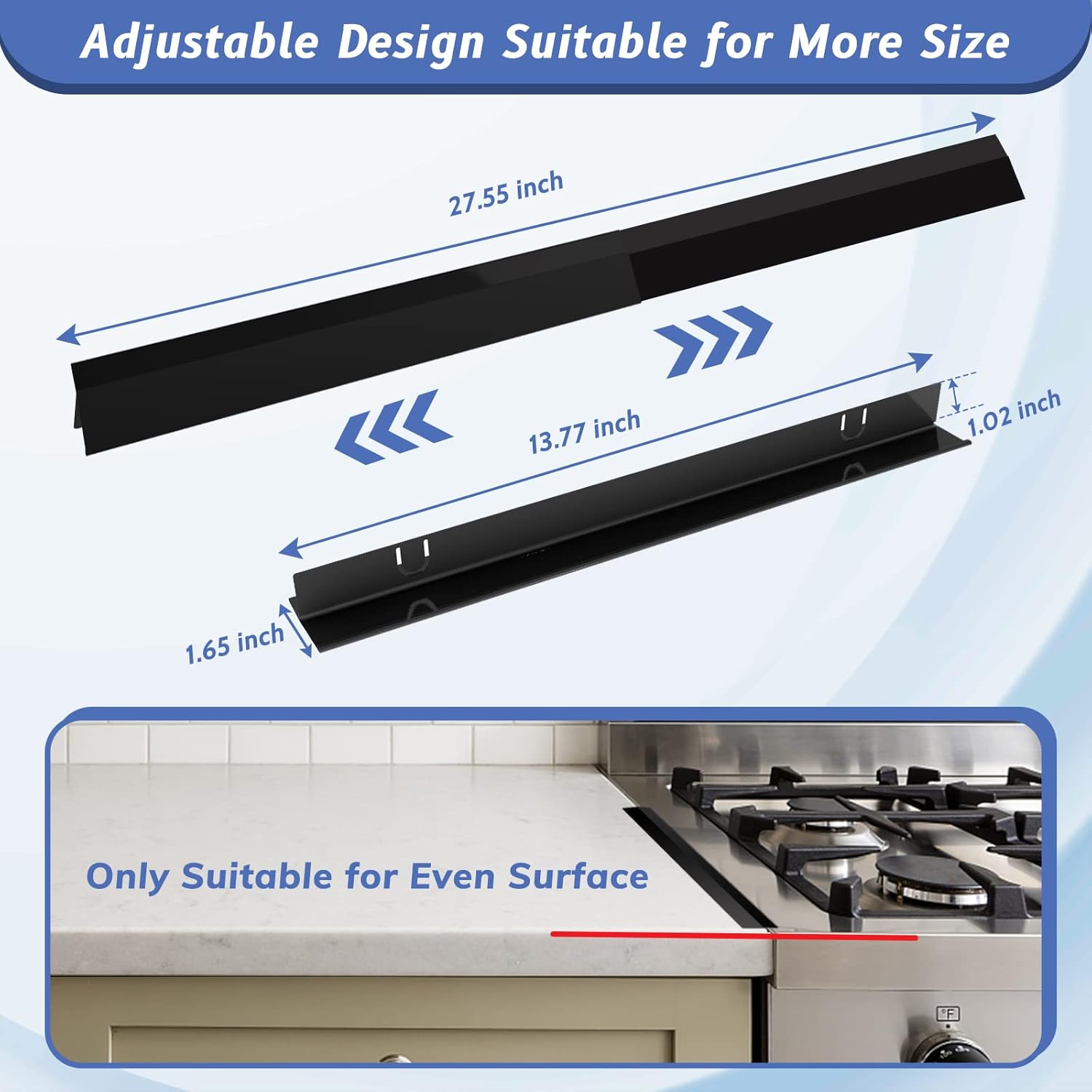Featuring an extendable design from 13.8" to 27.6", this oven gap filler adapts to your needs. (Size: L 13.8–27.6" x W 1.65" x H 1.02"). Note: Not suitable for uneven surfaces.